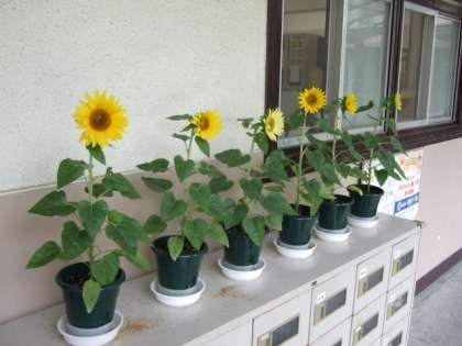 あいにくの天気が続きますが、廊下に咲くヒマワリのように早くすっきり晴れた太陽が見たいです。