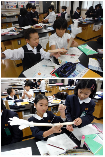 そこで,角材を蝶つがいで固定し,紐ゴムが通るヒートンを付けた自作の教材を使うことにしました。