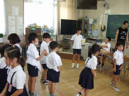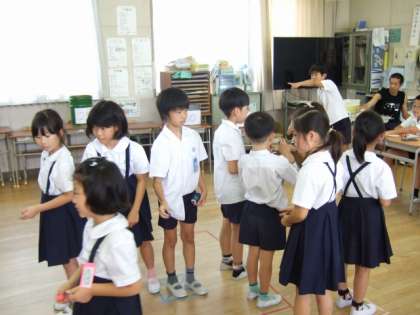 6年教室では、いろいろな箱にボールをシュートする「ゴミ箱シュート」が行われていました。