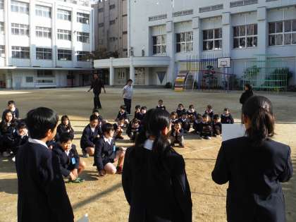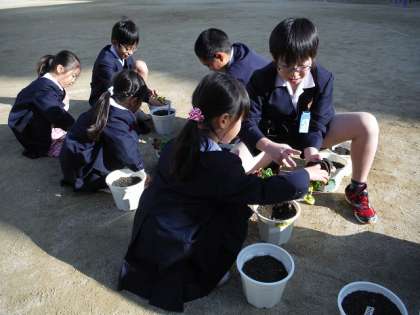 豊崎小学校では,毎年「地域花いっぱい運動」に取り組んでいます。春が近づく2月に,自分たちが育てた花の鉢を日頃お世話になっている地域の方々に贈り,感謝の気持ちを伝えます。地域のあちらこちらで贈られた花が街を彩り,ふれあいを深めることにもつながっています。