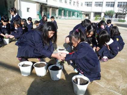 今日は,三ヶ月後の「花のプレゼント式」に向けた準備として,花の苗や球根を,ペア学年で協力して植えました。