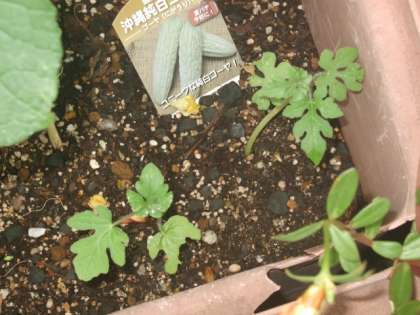 他の植物に押され気味ですが、そっとゴーヤの葉を持ち上げると。。。