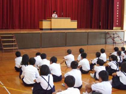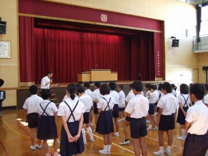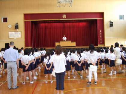 最初に校長先生からの話がありました。内容は夏休みの過ごし方や1学期最初の約束確認についてです。1学期最初の約束「あいさつ・集中・自立」を10点満点で子どもたちに自己採点させたところ、10点満点は0人、9点は数人、8点は20数人といった結果でした。2学期はもう少し頑張って欲しいものです。