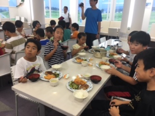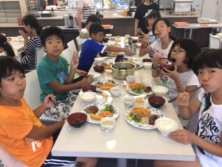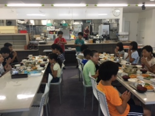 食堂にて夕食です。食事係からのクイズがありました!今日の夕食は煮込みハンバーグです。美味しく頂きます!!