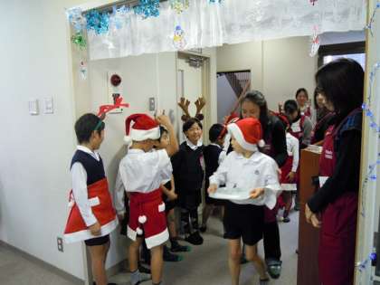 また,配り係を担当した子どもたちは,サンタクロースやトナカイの帽子やカチューシャをつけてお手伝いをしました。
