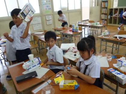 家庭にある牛乳パックや食品トレイ等を使って製作するのですが,