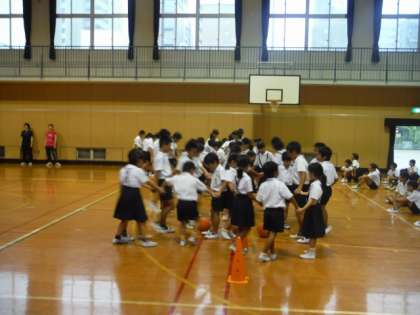 ルールは、縦割り班で手をつないで円を作り、円の中に入れたボールを班のみんなでドリブルしながらゴールを目指すというものです。