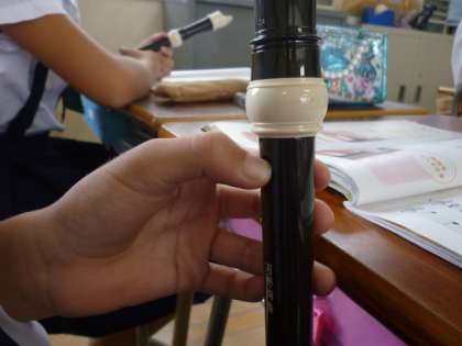 リコーダーの練習で,高い方のミ・ファ・ソの練習をしています。高い方の音の場合,左手の親指をすこしずらすか,親指を少し立てるかのどちらかの方法で少しだけ空気をぬくことでその音を出します。これが最初はなかなか難しい技術です。また,一つの音を出すだけならできても,曲の流れの中で素早くその操作をすることが難しいです。しかし,これからもっとたくさんの曲を演奏するためには乗り越えなければならないところです。また,繰り返し練習していきます。