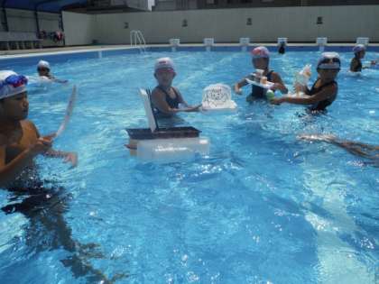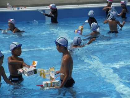 プールの水が軽く波打っていたこともあって、思うように浮かばず、沈んでしまったり、一部がこわれてしまったりするなどのハプニングもありました。