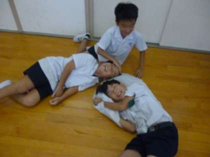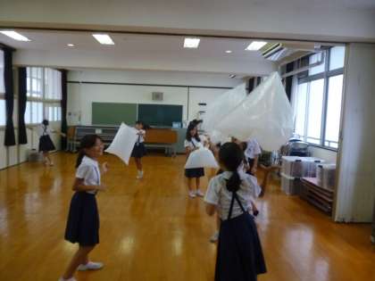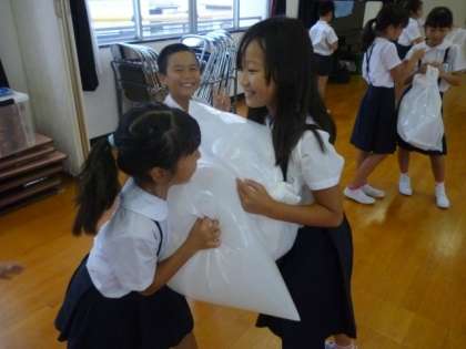 導入で,大きなビニール袋に空気を入れ,押し合いをしたり,手で上にはねあげたり,枕にしたりして,その感触を確かめてみました。「やわらかい感じがする」「やわらかいけど,あるところまでいくとはねかえってくる感じ」と,大切なことに気づいている様子でした。