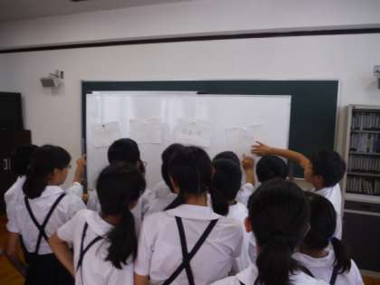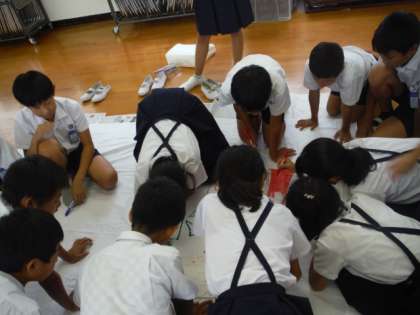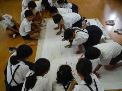 帆船へ掲げる旗を作製。修学旅行に向けてクラスのめあて、各班でのめあてを旗に描きます。今日はクラスのめあてを旗に描きました。
