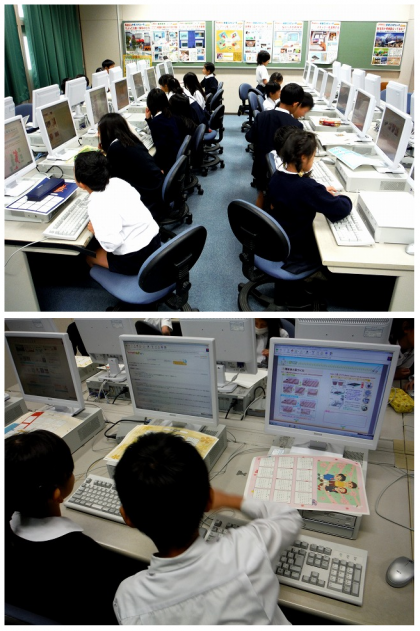 エプロンを自分の机に持ってきて,4〜5人づつ机をくっつけておきます。テーブルクロスもセットしておけば,給食の準備は万端。4時間目は時間ぎりぎりまで大好きなパソコン室で学習できる(^_^.)