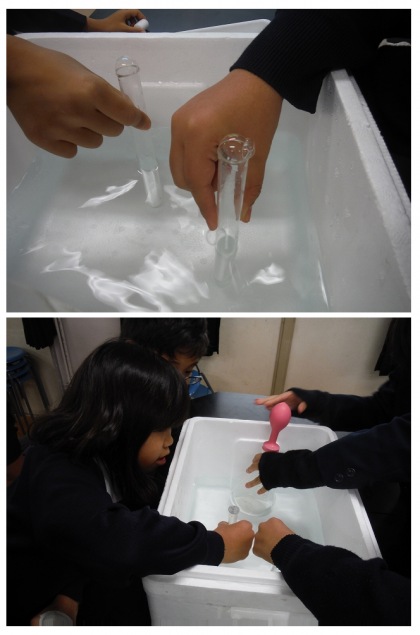 子どもたちは今日の実験から,栓が飛んだり,せっけん膜がふくらんだりへこんだり,風船がふくらんだりへこんだりすることに関係しているのは,「とじこめた空気の温度」だということに気づいてきたようです。