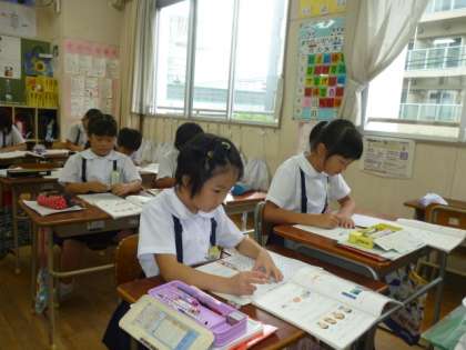 国語でローマ字を学習しています。大文字と小文字があり、4本の線に書くこと。伸ばす音や「きって」などのつまる音の書き方の約束を覚えて、たくさんの単語を練習しました。慣れない文字ですが、楽しみながら取り組み、自分の名前も書けるようになりました。パソコンのローマ字入力もバッチリですね!