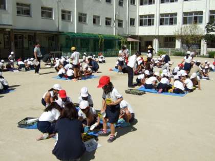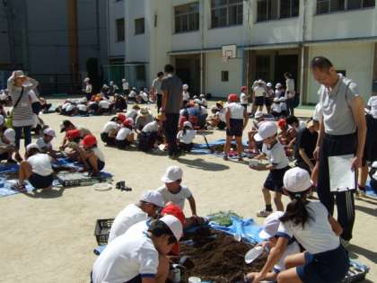 1年生と4年生、2年生と6年生、3年生と5年生がそれぞれ5班に分かれて、プラグ苗をビニールポットに植えました。