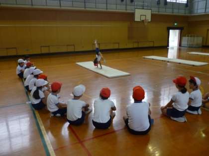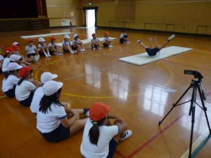 タブレットを使いながらグループでアドバイスし合って練習したことで、一つ一つの技が上達してきました。今日は学習のまとめとして連続技の発表会をしました。友だちみんなに見られている中で演技するのはとても緊張しますが,それも大切な経験です。一所懸命演技した後,緊張から解放されてホッとした笑顔がとてもよかったです。