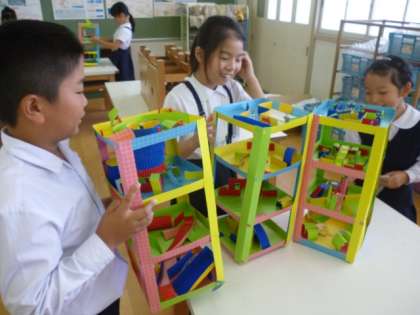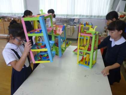 図画工作で取り組んできた「コロコロガーレ」が完成し,友だちと交換して遊んでみました。