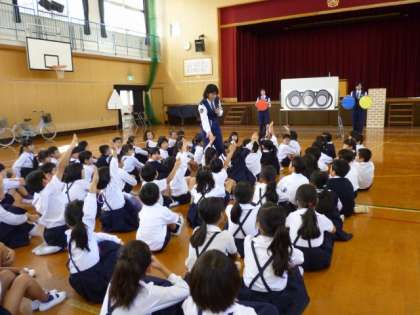 大阪府警と大淀署から警官の方が子どもたちに『歩行のしかた・信号のルール』についてお話をしてくださいました。