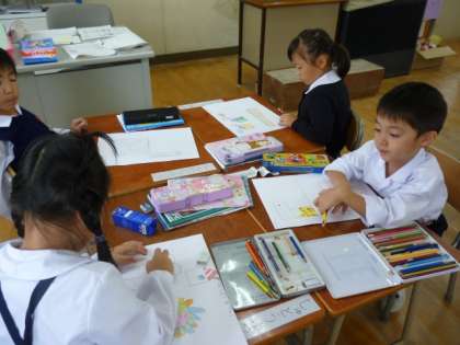 参観でも見ていただいた「かたちあそび」の学習です。いろいろな箱の面を使って絵を描きます。四角や丸を組み合わせていろいろなものを描きました。