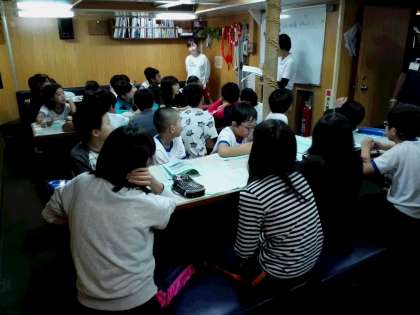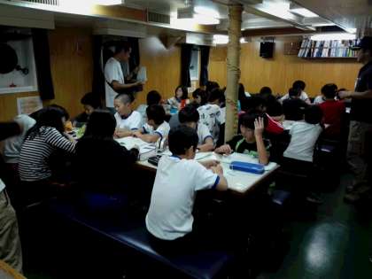 メスルームで秋の星座の学習をした後、デッキで星空観察です。残念ながら曇り空のため星は観られませんでした。メスルームに戻り、今日の振り返りをしおりに書きました。