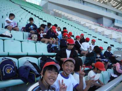 北区の学校が集まって長居スタジアムでスポーツ交歓会がありました。スタジアム内に入ると、