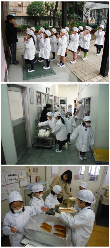 給食室の前で整列して「○年1組 いただきます。」とあいさつします。