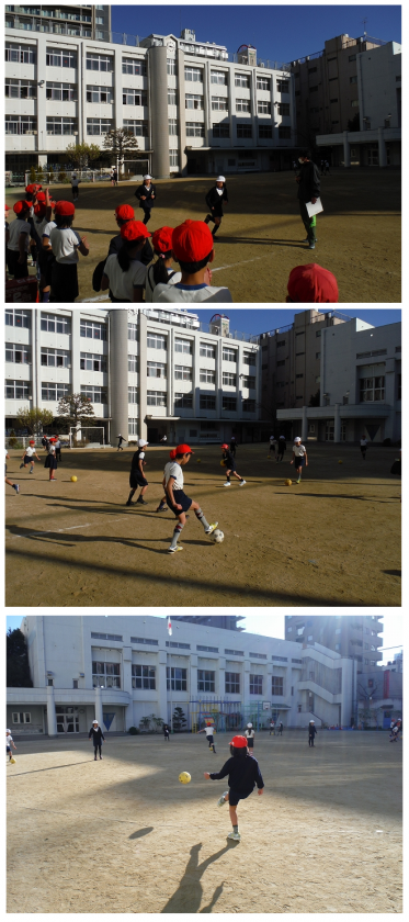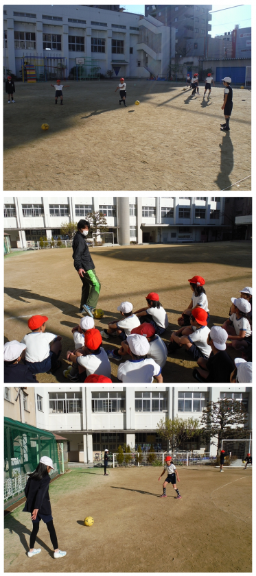 その後,サッカーボールをペアで蹴る練習をしました。
