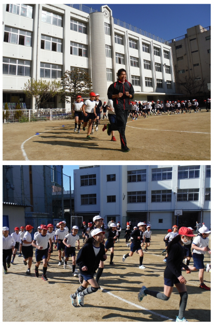 20分休みに,全校児童がそろって運動場を一定のペースを保って走りました。前半3分のかけ足は学年で2列に並んで走り,1分間の並足で呼吸を整えます。後半の3分間は,自分のペースで走ることもできます。