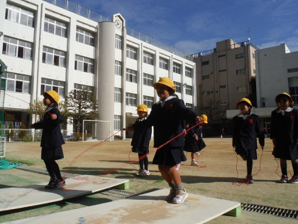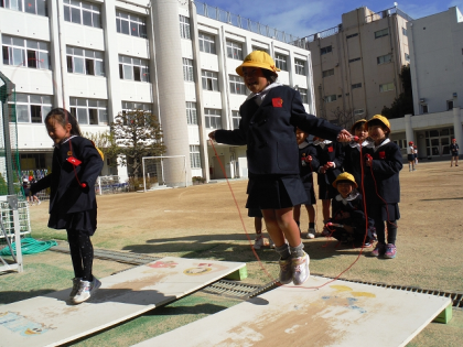 校長室前にあるジャンピングボード(なわとび板)が今年も大活躍!
