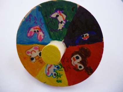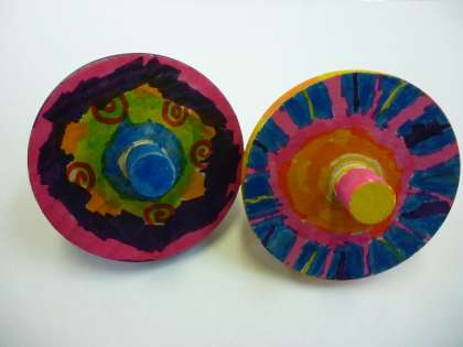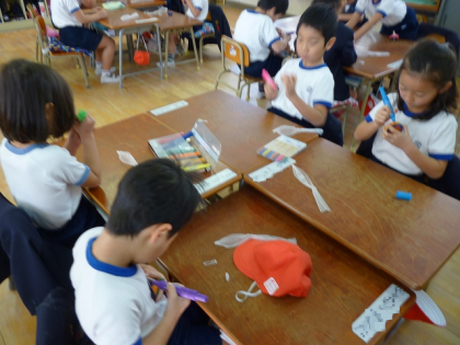 生活科の学習で「こまづくり」をしました。一人一人が自分の好きなデザインのこまをつくりました。できあがったこまを回そうとしましたが,なかなか上手に回すことができません。特に難しかったのは,ひもの巻き方です。友だちどうし教え合って少しずつ上手に巻けるようになってきました。練習を積んで早く上手に回せるようになってほしいです。