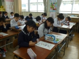 まず、「交通安全」の意味について考えました。その後、これまでに、道路を歩いたり自転車に乗ったりしている時に怖い経験をしたことがあるかどうかたずねたところ、たくさんの子どもたちが発表しました。自転車での怪我もありました。