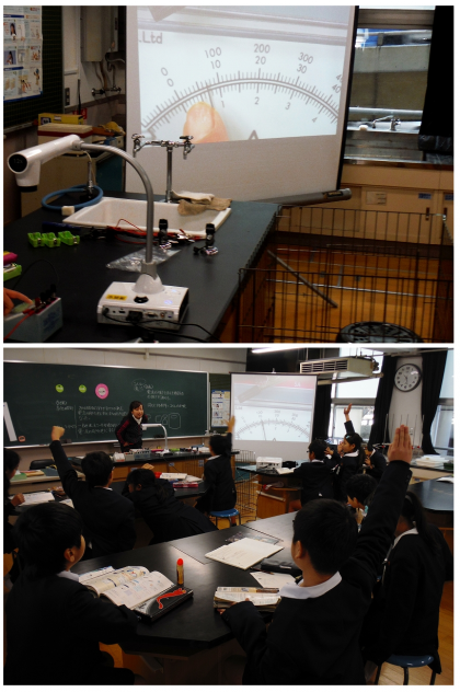 電流計のマイナス極側をどの端子につなげばよいか,端子のつなぎ方によってどの目盛を見て電流の大きさを調べるかなど,教材提示装置で拡大した映像を見せながら説明しました。