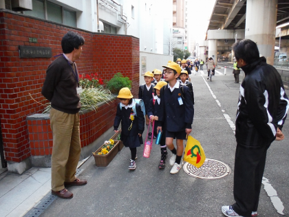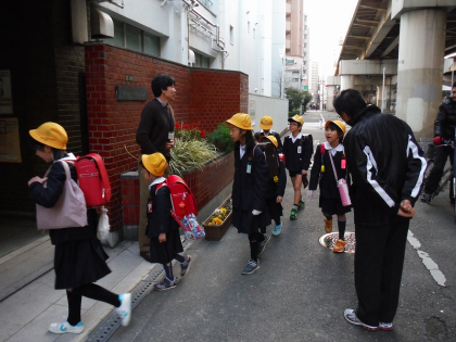 登校班の班長を先頭に,今日も元気に子どもたちが学校に登校してきました。