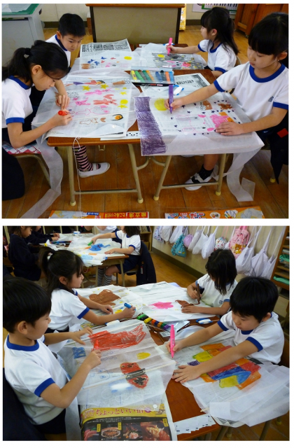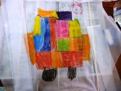 不織布でできた「ぐにゃぐにゃ」だこに,カラーペンで好きな絵をかきました。