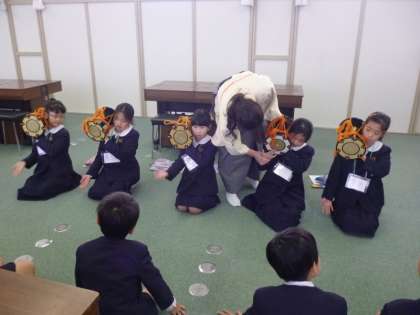 仕舞のグループには,山本先生が一人ひとりの横について動きを教えてくださいました。一人が舞う間に他の子たちが謡います。扇の開閉がなかなか思うようにできなかったり,自分の場所に戻るときに廻る方向が分からなくなったりします。でも,時間の終わりには「よくがんばったよ」とお褒めの言葉をいただきました。山本先生は「だんだん厳しくなるからね」とおっしゃっていましたが,それはレベルが上がって要求が難しくなっていくということ。厳しくしていただけるのはありがたいことですね。