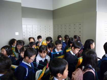 次に、郵便局についてのDVDを観たり、消印を押す機械と手紙を区分する機械を見たりしました。自分たちが書いたハガキを実際に通してもらい消印が押される様子と区分される様子を目の前で見ることができました。