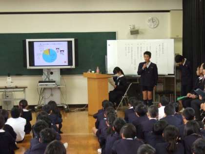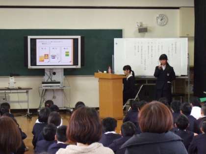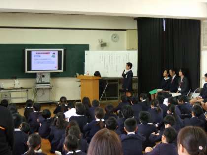健康委員会の児童は歯磨きやおやつについてのアンケートから発表内容を考え、上手に発表できました。