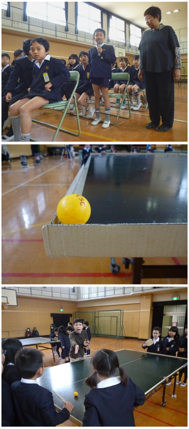 ピンポン玉には音が鳴るように内部に鉄の球が数個入っています。転がすとシャカシャカと音がします。これで球がどこに来るのかがわかります。台の外枠には一部枠を設けていて,球が落ちるのを防いでいます。簡単なルール説明の後は,お手本です。