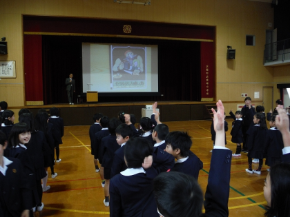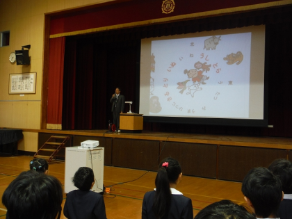 全校朝会で,教材提示装置を使って「ゼラルダと人喰い鬼」の絵本を提示しました。