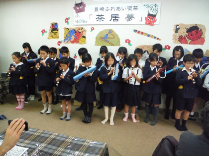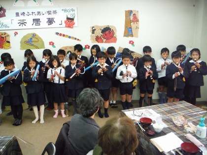 玄関で挨拶をして,みんなで合奏と合唱をしました。係の子から挨拶と曲の紹介。