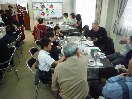 その後は,前半と後半の2班に分かれて待望のティータイム。お菓子と清涼飲料水で交互にお客さんと給仕役をします。配っていただいたお菓子の他にテーブルには福豆がのっています。みんな食べたそう…誰かが尋ねにきました。答えは…そう,テーブルで一緒にいらっしゃる地域の方に尋ねるのがいいですね。