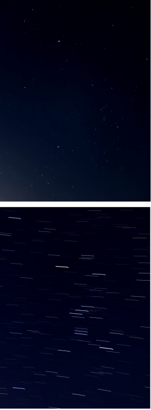 下の写真は,10分間露光して,オリオン座を撮影したものです。星座の形が変わらず,一定のの方向に動いているのがわかりますね。