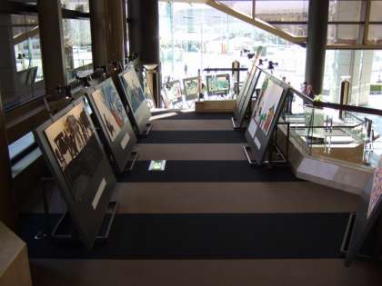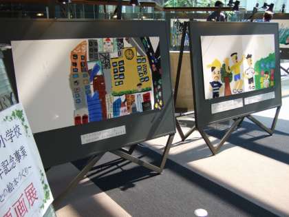 2015年度の創立100周年事業で,みんなで協力して作った絵本「かんこうさんがふってきて」の原画パネルを展示しています。大きなパネルに子どもたちが描いた原画の筆の跡も間近で見ることができます。期間中にぜひご覧ください!