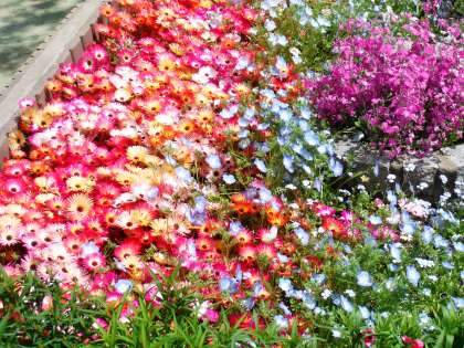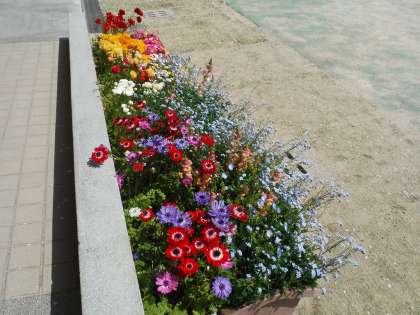 北校舎の前の花壇には、所狭しと「リビングストーンデェイジー」が咲き、水色の花の「ネモフィラ」、ほかの花より高く桃色の「サクラソウ」が太陽の光をいっぱい浴びて咲いています。写真を撮っているとモンシロチョウが飛んできました。どこに写っているかな。