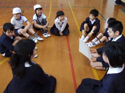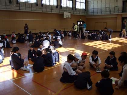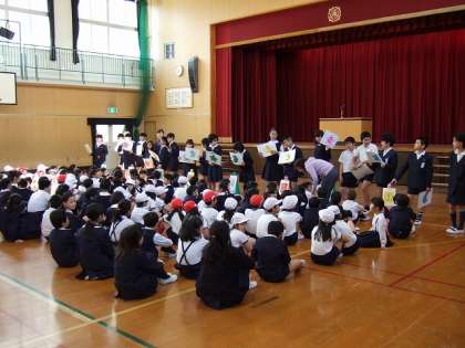 今日は,第1回の児童集会。新しいたてわり班の顔合わせをしました。この1年間,いろいろな活動をしていきます。1〜8班の月組,星組に分かれて,一人ずつ自己紹介をしていきました。