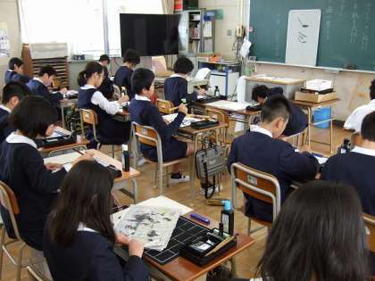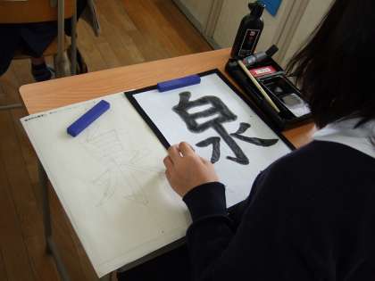 今回書くのは「泉」という字。「水」の部分の「はね」や「はらい」が難しい字ですが,がんばって書きました。「はらい」の力加減や筆使いのコツをつかんで上手に書く子が増えてきました。