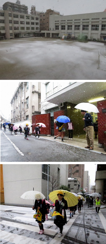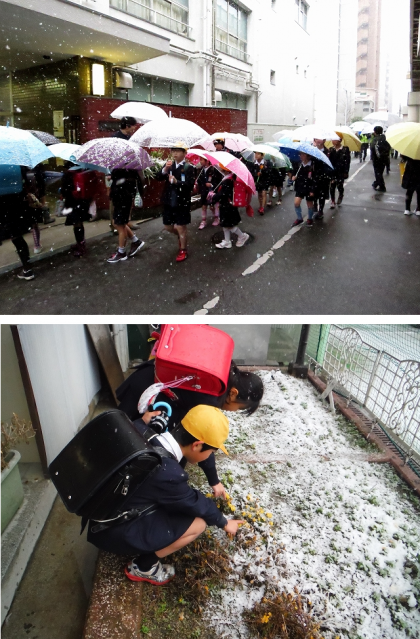 雪が降る中,子どもたちが集団登校しました。学校の南側の道路は雪が積もっていて,子どもたちは運動場には雪がもっと積もっているかな?と期待していたようです。