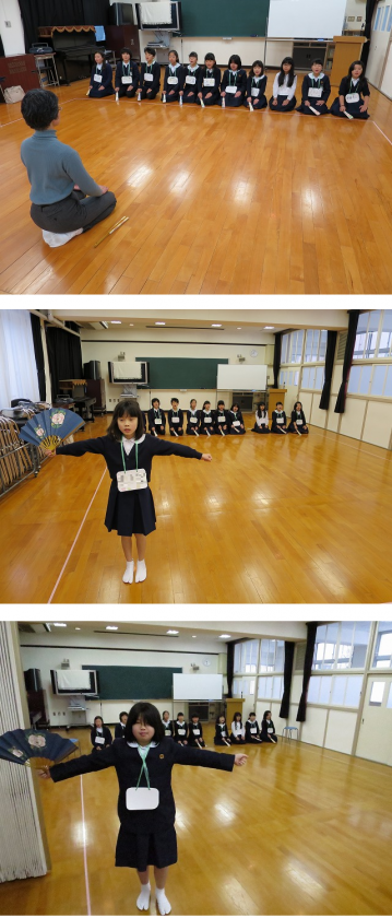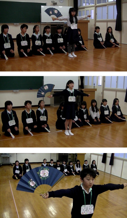 一人ずつ「玄象」の仕舞を舞いました。舞い方はみんなだいぶ覚えてきましたね。ただ,謡を謡うときに,仕舞を舞う友だちが気になって,そちらに向いてしまいます…。