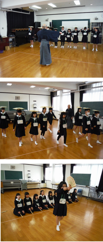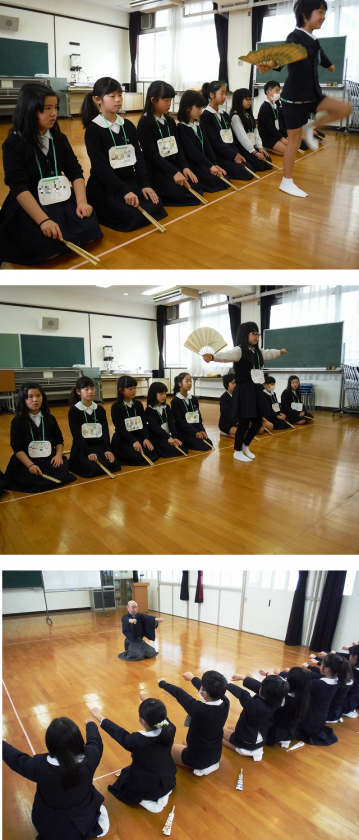 今度は扇子を頭に置いて,腕を前にして歩きます。能楽で大切な重心をとった歩き方を意識することができました。
