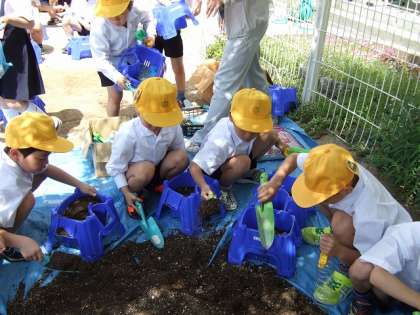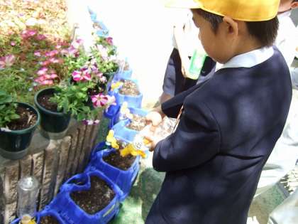 先週いろいろな草花の種をまきましたが、今日はいよいよあさがおを一人一鉢ずつたねをまき、「じぶんのあさがお」を育てます。